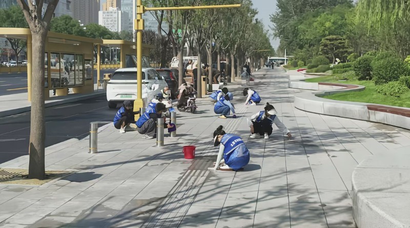 集團(tuán)公司黨員干部率先垂范,職工緊密跟隨,近200名“市政藍(lán)”奔赴工程現(xiàn)場(chǎng)開展志愿服務(wù),齊心協(xié)力對(duì)全線南、北半幅人行道的平石及側(cè)石進(jìn)行描金修復(fù)與污漬清理,同步推進(jìn)地磚灌縫精細(xì)化作業(yè),細(xì)心擦拭燈桿、隔離護(hù)欄、指示牌、公交站臺(tái)等城市“家具”,勾勒出城市綠化宜居“金名片”。